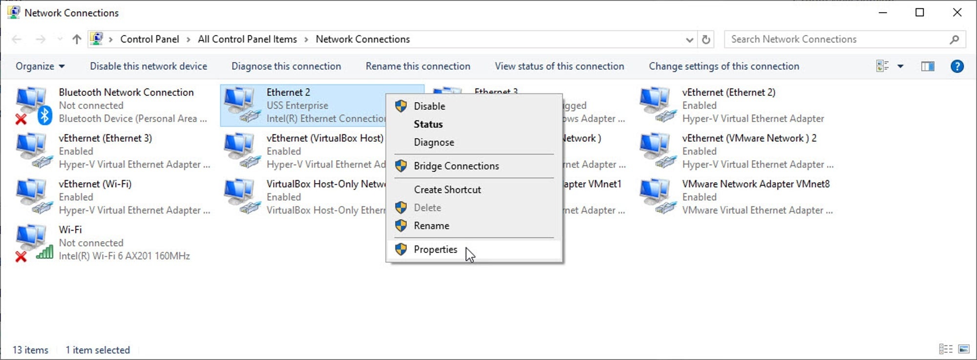 3. روی کانکشن فعال خود (Wi-Fi یا Ethernet) راستکلیک کرده و `Properties` را انتخاب کنید.