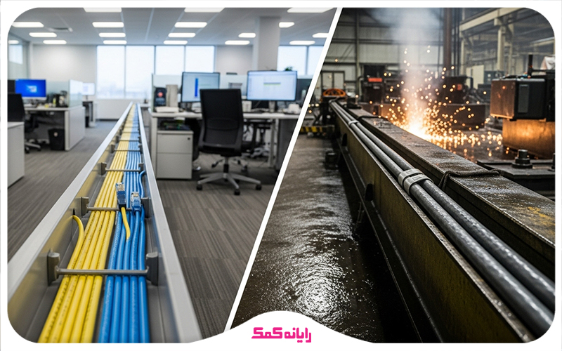 کابلکشی در محیطهای تجاری بزرگ (مثل ادارات، هتلها، بیمارستانها) و محیطهای صنعتی (مثل کارخانهها، کارگاهها) تفاوتهای مهمی با کابلکشی خانگی داره. اینجا دیگه فقط سرعت مطرح نیست، بلکه دوام، ایمنی، مقاومت در برابر شرایط سخت محیطی و رعایت استانداردها و مقررات حرف اول رو میزنه.