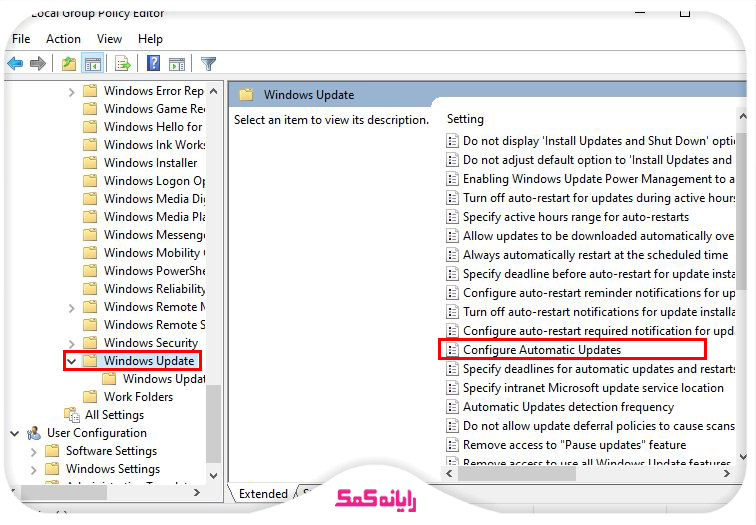 - بعد نیازه در میان گزینههایی که در سمت راست میبینین ، Configure Automatic Updates را پیدا کرده و دو بار روی آن کلیک کنین.