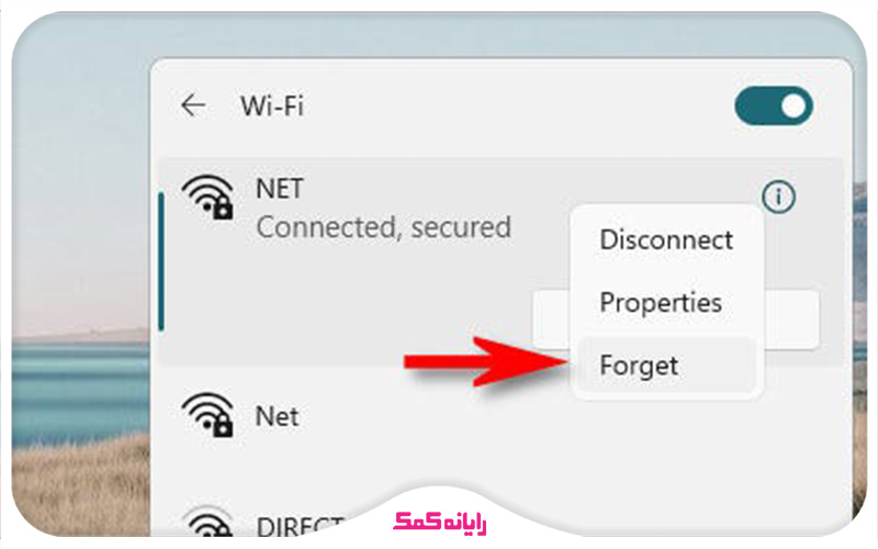 5. شبکهای که قصد حذف آن از لیست را دارید انتخاب نموده و سپس بر روی گزینه Forget کلیک کنید.